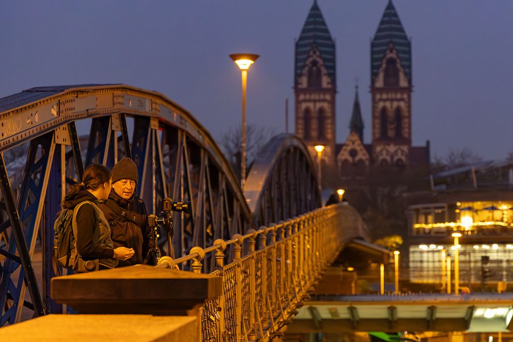 Gut vorbereit hat sich die Gruppe am Konzerthaus in Freiburg getroffen. Absprachen und technische Diskussionen sind immer gut - z.B. am Standort auf der blauen Brücke. Das zweite Bild in der Reihe zeigt die UB - ganz so blau war der Himmel nicht, wie die Kollegen in der Nachbesprechung bemerkten. Das dritte Bild zeigt einen schönen Kontrast zwischen dem Gelb der Beleuchtung und dem Nachtblau des Himmels über Freiburg. Und was macht der/die Fotograf:in, wenn die blaue Stunde vorbei ist? Der Blick wandert auf den Boden und sieht die Reflektionen in Regenpfützen. Blickt in Schaufenster und findet auch Goldenes. Oder lässt zum Schluss die Straßenbahn durch das Bild rasen.